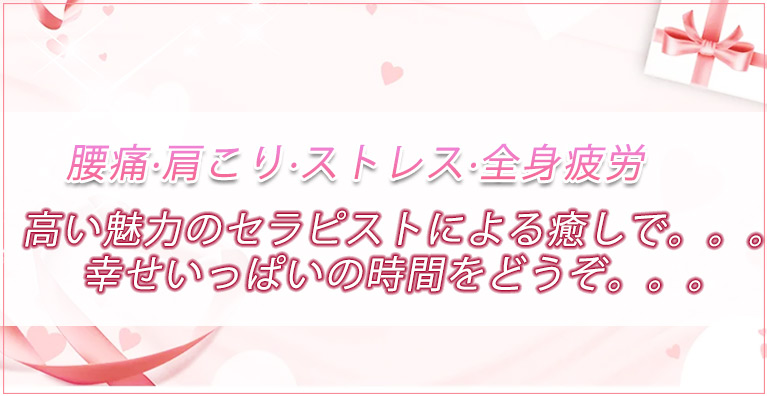 当店では、アロマオイルの効能と当店自慢のセラピストによるリンパマッサージの相乗効果による、癒しのひとときをお客様お一人お一人にお届けしております、自然で心やすらぐ優美な香りを、施術中はもちろんご帰宅お休みになってから翌日朝目覚めでまで楽しんで頂けます、どうぞゆっくりご堪能ください。